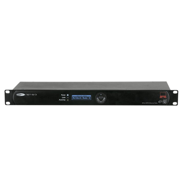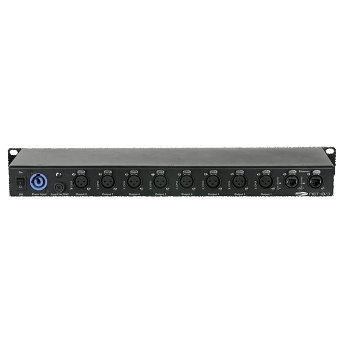 Le NET-8/x comporte un interrupteur réseau intégré pour permettre de l'utiliser comme répéteur Ethernet, et 8 univers DMX-512 isolés qui peuvent être utilisés en entrée ou sortie.